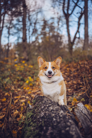 Dog breed Welsh Corgi Pembroke walking in autumn park