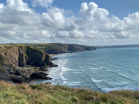 Welsh coast. Cliff edge, blue sea, and the Atlantic ocean, on a summer day, showing sea caves, beaches, and blue sky with fluffy white clouds.