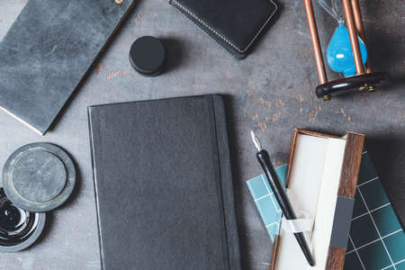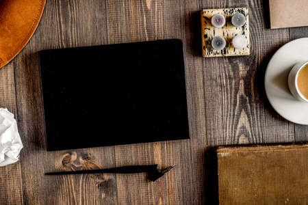 Black leather book, magnifying glass and quill pen on the brown wooden desk background with copy space.