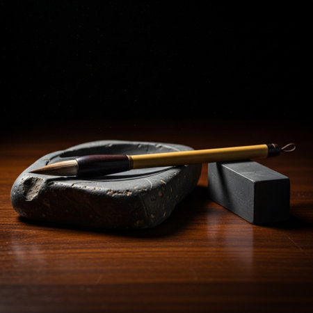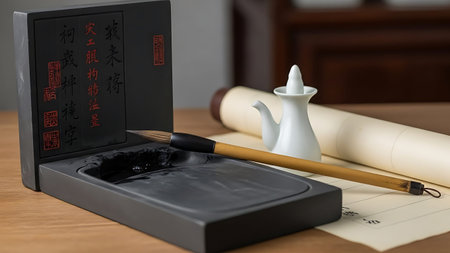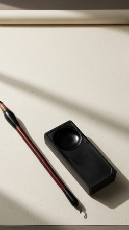 A vertical, tall composition (9:16) showing a classic calligraphy brush and ink stone set placed on