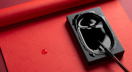 A chinese calligraphy set with a brush, ink, and paper on a wooden table with a lunar new year theme in a traditional setting.