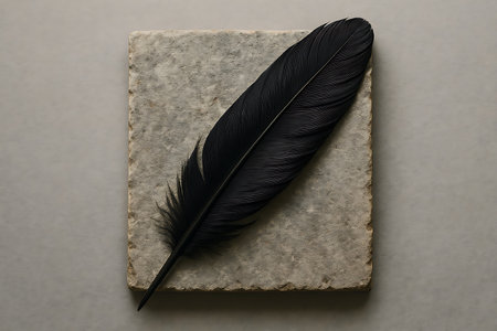 A solitary black feather rests elegantly upon a square grey textured stone, creating minimal impact.
