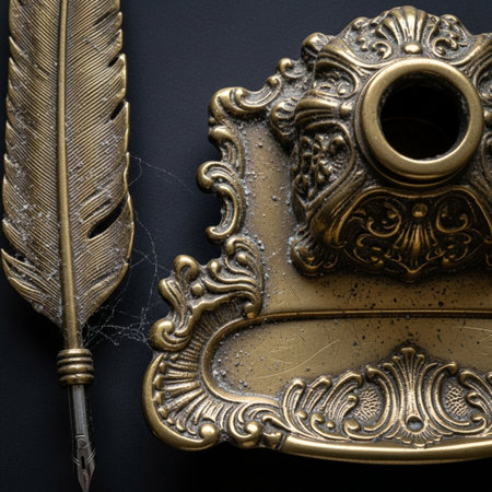 High angle top-down cinematic view of a tarnished brass replica of a colonial-era quill and inkwell