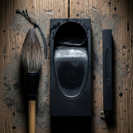 Editorial, cinematic side profile silhouette of a traditional East Asian calligraphy set, including