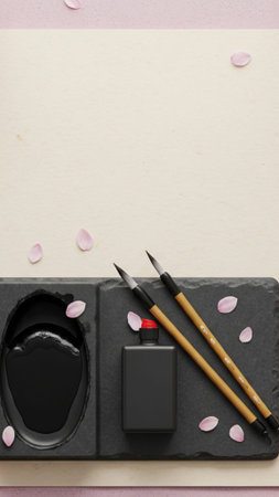 A high-definition vertical still life (9:16) capturing the elegance of Japanese calligraphy tools. T