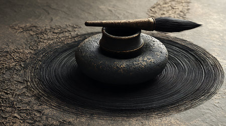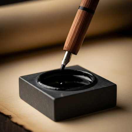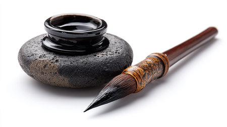 With a steady hand, an artist dips a traditional brush into rich black ink, beginning a stroke on clean white paper.