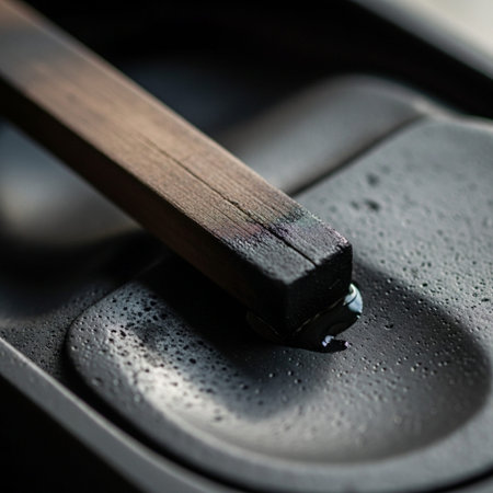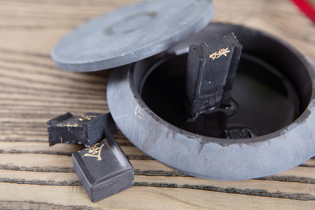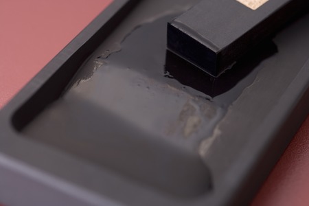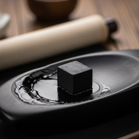A deeply textural, square format close-up of a traditional sumi ink stick resting upon a wet suzuri
