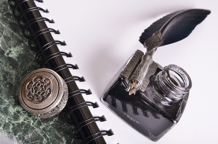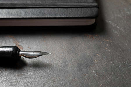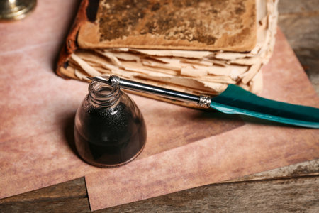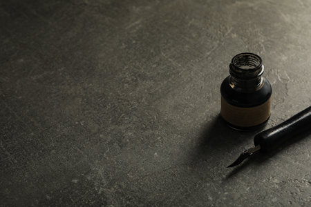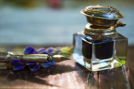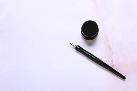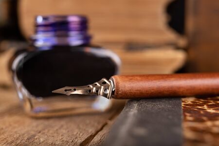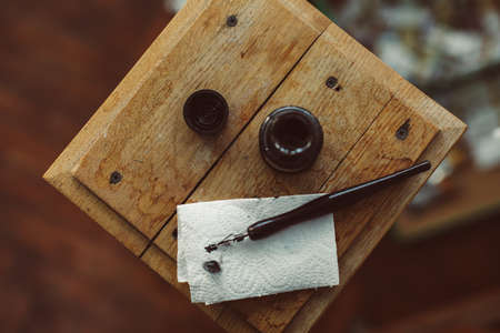 Calligraphy nib and ink in inkwell on a wooden table. Writing accessories in the old workshop. Dark background.