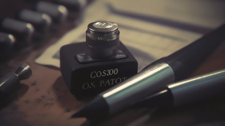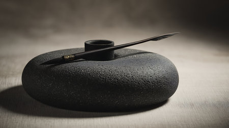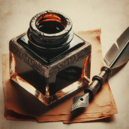 In the warm glow of a study lamp, an elegant vintage pen rests beside a pool of black ink, ready to capture a fleeting thought or begin a timeless story.