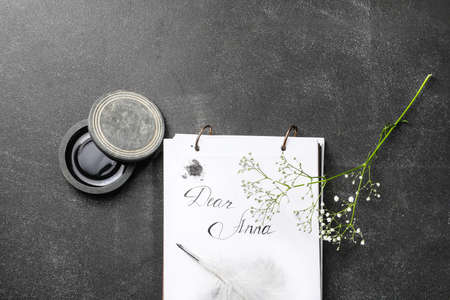 Envelope, paper, white flowers, black ink and fountain pen. Styled feminine desk workspace with white flowers, calligraphy nib, ink, envelope and white note card.