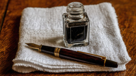 An antique fountain pen rests alongside an inkwell atop a folded white cloth, likely on a wooden surface. The pen features a dark wooden barrel and gold accents. The glass ink bottle is square-shaped, filled with black ink. The composition is lit by soft, natural light, creating a classic aesthetic suitable for various editorial and commercial applications.