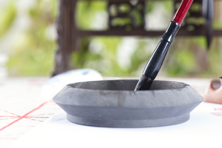 Abstract white paper with bamboo calligraphy brush and inkstone on old wooden table. picture for add text or greeting card chinese new year. Chinese traditional painting text