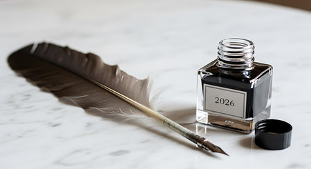 Quill pen inkwell 2026 label. New year concept writing future plans.
