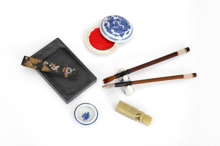 An editorial still life photograph capturing the essential 'Four Treasures of the Study' for traditi