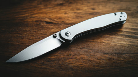 A sleek stainless steel pocket knife mockup, unfolded on a dark wooden surface, showcasing its sharp, functional blade design.