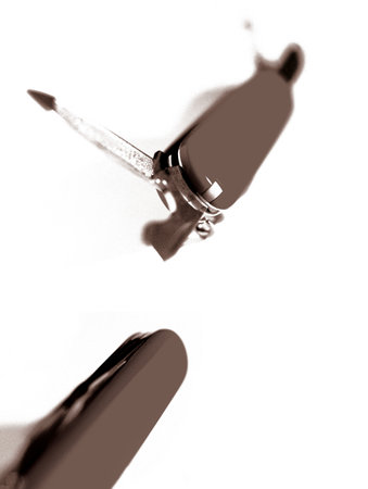 pocket knife with some bandage are on the black cloth under red light. B/W
