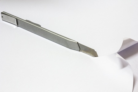 Red sharp office stationery knife with a paper cutting blade on a desktop office desk. Business work.