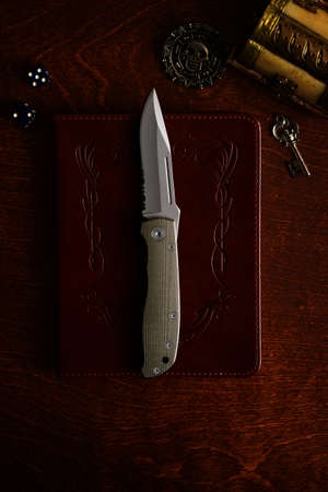 Tactical folding knife for survival and active lifestyle and recreation, on a dark background