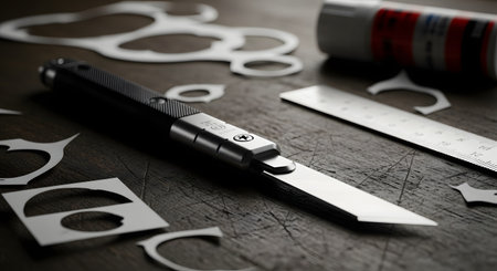 A close-up of a precision craft knife resting on a textured dark wooden surface. Surrounding the tool are intricate paper cutouts,a metal ruler,and a tube of glue,suggesting a meticulous crafting or design project in progress.