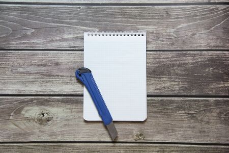 Notepad with a blank white sheet in a checker paper with stationery knife lies on the background of wooden boards
