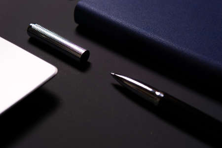 Pen placed on notebook on black background. High angle view. Copy space room for text.