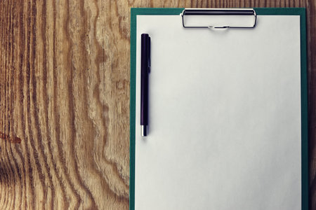 Low angle view of blank white piece of paper on a clipboard folder and open ink pen lying on top of it. On rustic wooden desk over navy blue background.
