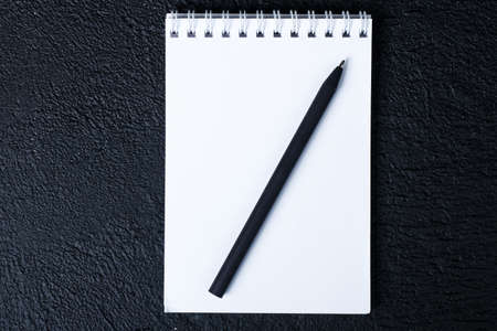 Black notepad with pen on black table close up