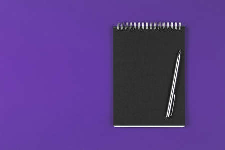 black notebook with pen on the violet background, school notebook on the purple desk, office desk with notebook