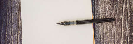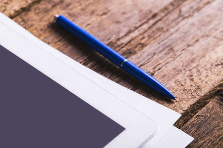 Pen and blank note paper on vintage wooden table.Background concept with copy space.