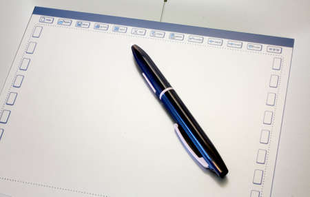 Opened notepad with automatic plastic ballpoint pen close up.