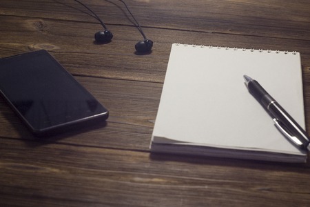 Headphones, phone, notebook and pen on a wooden background