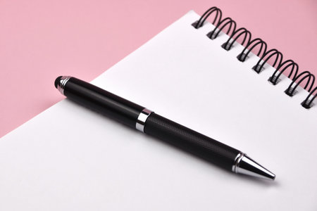 Pen and notebook on a pink background. Copy space for text.
