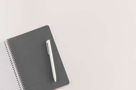 Spiral opened notebook with gray sheet and white pen. Layout and flat lay with place for text isolated on white background. Back to school. Top view, copy space. High resolution. Student workplace