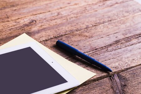 Blank modern digital tablet with papers and pen on a wooden desk. Top view. High quality detailed graphic collage.