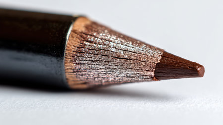 Close up view of brown colored pencil, showcasing its sharpened tip and textured wood. metallic sheen on pencil adds touch of elegance, making it perfect tool for artists and students alike