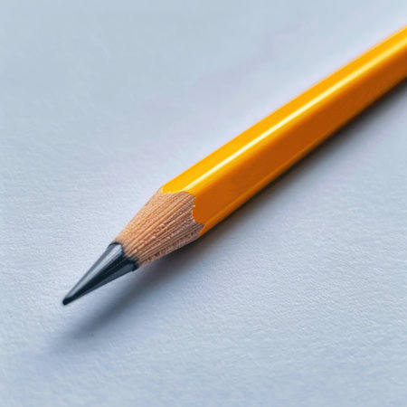 A close-up image of a yellow pencil resting on a light surface, showcasing the details of its sharpened graphite tip and wooden texture, perfect for various projects.