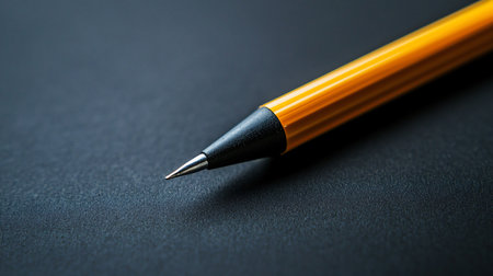 A detailed view of a pencil placed on a black surface, highlighting its tip and texture.