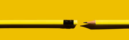 Colored pencil close-up with selective focus on the stylus and a blurred yellow background. Copy space for text.