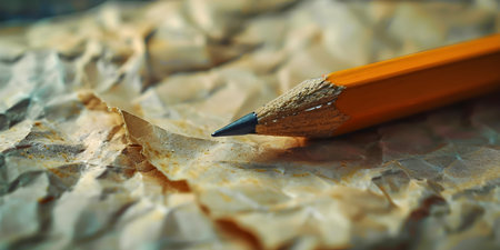 A finely pointed pencil's shadow dances over rough, wrinkled paper, capturing a moment of quiet inspiration and creative potential.