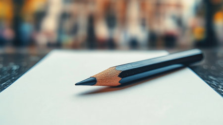A black pencil stands upright on a smooth surface, showcasing its sharp tip. The soft focus background gives an artistic vibe, enhancing the simplicity and elegance of the image. Perfect for themes of creativity and minimalism.