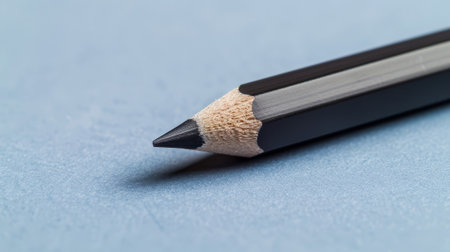 A detailed macro shot of a sharpened pencil with a black and wooden body lying on a gray surface. The focus is on the pencil tip showing its sharp point and intricate details of the wood grain. AI generated image