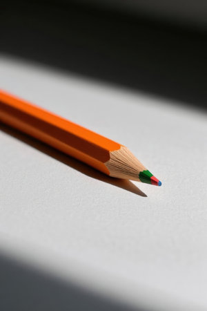 A diagonal row of penciils sit on a neutral table. Focus on one pencil. Copy space.