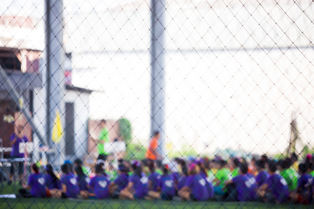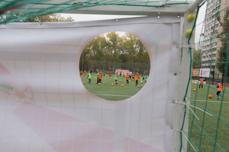 Children soccer team is warming on soccer field before a competition match, blurred behind the net for kid sport background and backdrop.