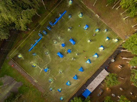 Aerial view of paintball court in the city public park. Top view.