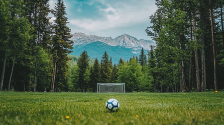 Soccer ball resting in goal on quiet field surrounded by trees and mountains