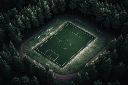 Aerial drone view of football soccer pitch field, green grass summer vibrant pitch playground in the forest, hidden in the green woods