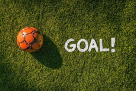 Composition of football on white line by goal post on grass pitch with copy space and green tint. sport and competition concept digitally generated image.