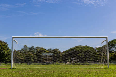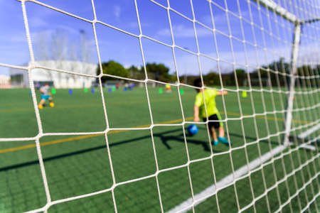 Football training. Crossed soccer nets soccer football in goal net with grass on outdoor playground in the background.