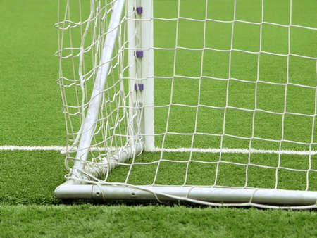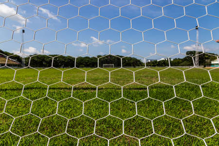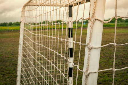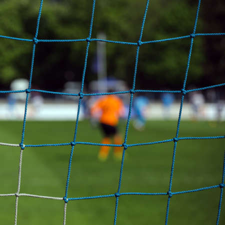 Soccer or football net background, view from beside the goal with blurred field pitch.