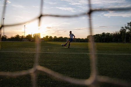 rear view of a football player scoring a goal in an empty goal in a concrete football court, concept of healthy lifestyle and urban sport in the city, copy space for text